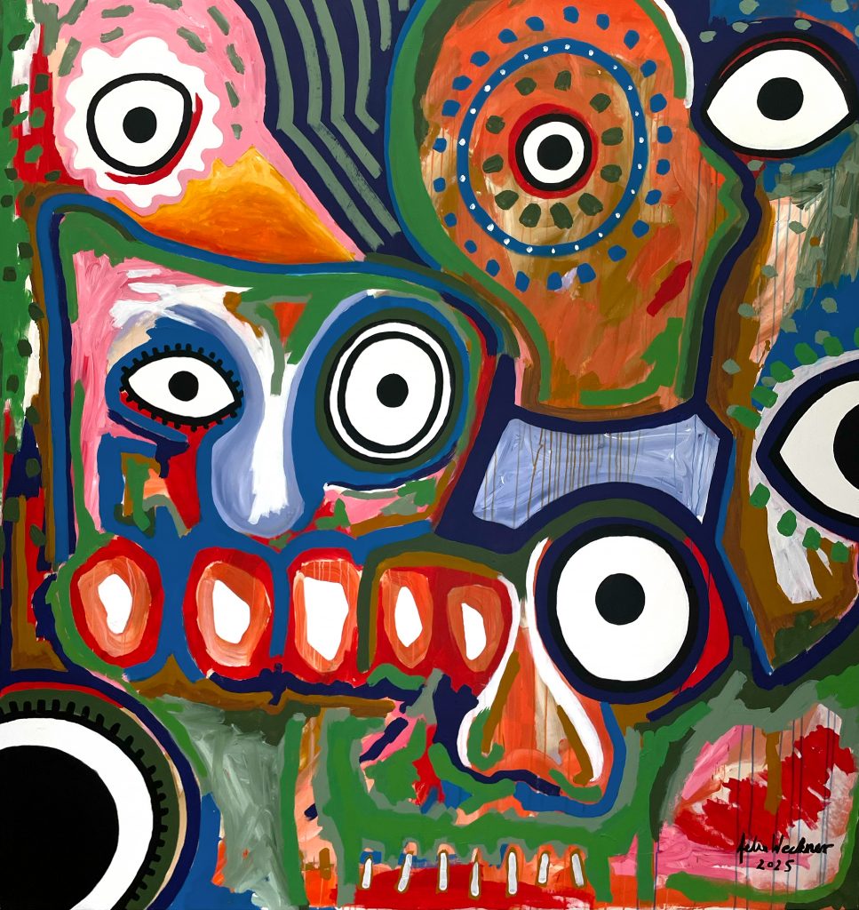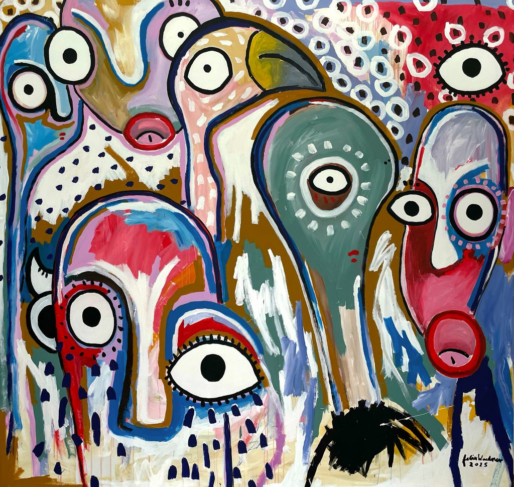 Innenleben eines zu schnellen Kopfes. (2025) – 180 x 190 cm – Acryl auf LeinwandWas ein schönes Miteinander. (2025) – 180 x 180 cm – Acryl auf LeinwandSeifenblasen & Dauerbeschallung. (2025) – 180 x 170 cm – Acryl auf LeinwandTrennungsangst. (2025) – 180 x 140 cm – Acryl auf LeinwandDer Redner zur Hörerschaft. (2025) – 180 x 220 cm – Acryl & Öl auf Leinwand Ich & Du. (2025) – 180 x 200 cm – Acryl auf Leinwand
